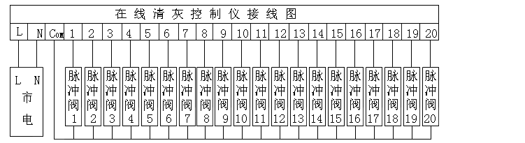 所有脉冲阀的“+”电源输入端并接后接端子+或Com。