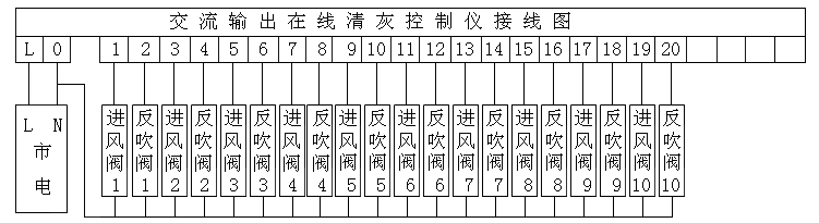 端子1、2、…分别接不同脉冲阀、提升阀的“L”电源输入端。