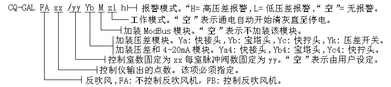 典型订货信息:CQ-GALFA8YB(8点不控制反吹风机带快插头压差) 或 CQ-GALFB8YB(8点控制反吹风机带快插头压差)